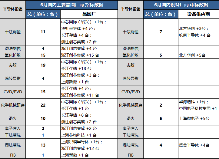 事件: 2021年7月份,根据中国国际招标网及各公司官网,中国半导体 6 月份的招投标数据现整理发出,其中北方华创、屹唐半导体获干法刻蚀设备订单高占7台,占比6月中国晶圆厂刻蚀设备需求的 47 %!如下图。
