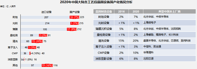 观点: 根据MIR DATABANK 数据,在中国市场,半导体晶圆产线上,刻蚀、光刻、薄膜三大工艺市场规模均超过200亿元,市场占比共超过了60%。其中刻蚀设备作为半导体三大核心工艺中的代表产品,其最高占据了整个半导体设备市场的21.5%的份额(干法刻蚀占主导地位,目前约占90%的刻蚀市场份额;干法刻蚀主要包括CCP(介质刻蚀)和ICP(硅刻蚀))。光刻设备约占20.8%、薄膜沉积设备约占20.5%,另外检测设备约占8.8%、清洗设备约占7.2%、离子注入设备约占4.6%、CMP约占3.9%。至2020年末,中国晶圆制造中刻蚀设备的国产化率只有 7 %、光刻设备小于1%、薄膜沉积设备为8%、量检测设备为2%、清洗设备为20%、离子注入设备为3%、CMP为10%、涂胶显影为8%。典型的中国本土厂商有北方华创、中微半导体、上海微电子、盛美半导体等,随着中国存储芯片产线兴建扩产以及国产设备的自主化和产品成熟化,预计刻蚀设备将加速完成中国本土替代。如下图。