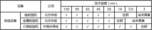 根据梳理,我们认为,在长江存储等主流晶圆大厂积极采用国产设备的情况下,极大地推动了国产化进程,目前新建 12 寸存储/代工/特色工艺生产线已陆续开始采用国产设备,为国内设备厂商提供了良好的产业生态。并且,介质刻蚀机是中国最具优势的晶圆制造设备,代表厂商中微半导体产品在业内较为领先,工艺节点已经达到先进的5nm,并且已经得到台积电的验证。北方华创也在硅刻蚀机中处在中国本土替代加速阶段,目前能够生产28nm 的硅刻蚀机,14nm 目前也在研发和小范围试产过程中。