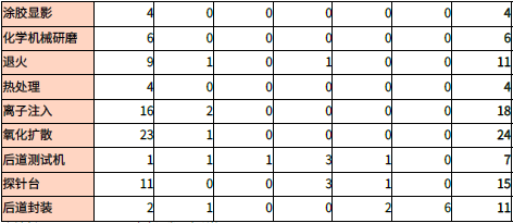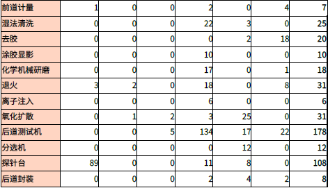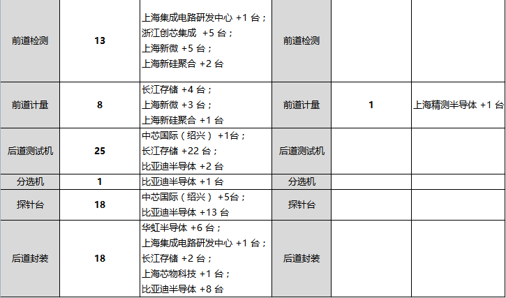华力微电子:作为华虹集团重要的子公司之一,华力二期12英寸集成电路芯片生产线项目经过22个月,在2020年10月正式投产,月产能达4万片晶圆。华力自2020年3月份以来密集招投标刻蚀、CVD、PVD、离子注入机等工艺设备。截至近日,华力二期累计采购620台工艺设备,其中国产设备52台,占比华力晶圆产线总设备需求的 8%,剔除量测设备的占比为13%;下图为2021 年华力微电子招标数据(单位:台)。